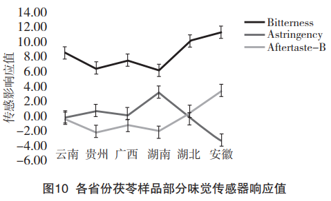 茯苓味覺信息的雷達圖分析可知,茯苓甜味顯著,但各產(chǎn)地之間差異不顯著。各產(chǎn)地的茯苓樣品味覺值的差異主要集中在苦味、澀味和苦味的回味上。因此,選擇苦味、澀味、苦味的回味進行分析探討產(chǎn)地之間的差異,結果如圖10所示。由圖可知,湖北和安徽的茯苓樣品苦味和苦味的回味都顯著高于長江以南——云南、貴州、廣西、湖南的茯苓樣品,且湖北和安徽的茯苓樣品苦味的回味在無味點0以上,長江以南的樣品苦味的回味都在無味點以下。對于澀味,長江以北的茯苓澀味在無味點以下,而長江以南的茯苓澀味都在人的無味點以上。
