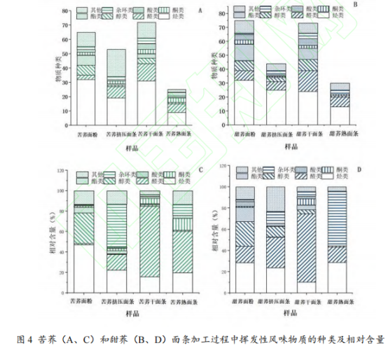 以上研究表明,擠壓加工及熱風(fēng)烘干可以促進(jìn)蕎麥面條風(fēng)味的形成,特別是熱風(fēng)干燥,其中全苦蕎面條風(fēng)味更加濃郁。