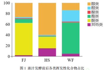 將FJ(發(fā)酵)、HS(后熟)、WF(未發(fā)酵)的濃汁樣品進行GC-MS檢測,揮發(fā)性化合物種類以及各類物質在樣品中的占比見圖1。由圖1可知WF樣品中共檢測出5類揮發(fā)性化合物,分別為:醇(13.56%)、醛(21.48%)、酸(1.56%)、酯(58.44%)、其他(4.96%),其中主要揮發(fā)性物質為酯類;FJ樣品中共檢測出6類揮發(fā)性化合物,分別為醇(26.45%)、醛(2.17%)、酸(1.21%)、酯(7.75%)、酮(60.45%)、其他(1.98%),其中酮類為主要揮發(fā)性物質;HS樣品中共檢測出6類揮發(fā)性化合物,分別為醇(59.92%)、醛(1.42%)、酸(0.63%)、酯(1.44%)、酮(21.60%)、其他(14.99%),其中醇類為主要揮發(fā)性物質。