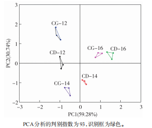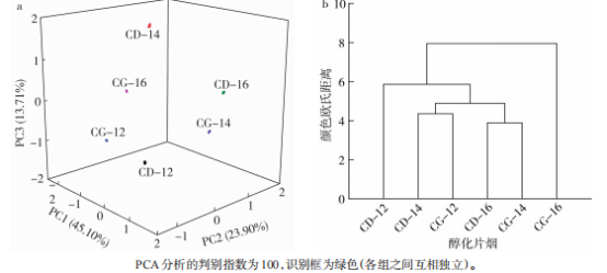 對(duì)樣品的電子眼數(shù)據(jù)進(jìn)行PCA分析,結(jié)果如圖2a所示??梢钥闯觯鞒煞?(PC1)、主成分2(PC2)和主成分3(PC3)之和達(dá)到了82.71%,可代表樣品的絕大部分信息。同時(shí),判別指數(shù)是用來(lái)表征樣品之間區(qū)分度大小的一種判斷方法。本實(shí)驗(yàn)中煙葉顏色的判別指數(shù)(評(píng)價(jià)選定目標(biāo)的判別質(zhì)量)為100,說(shuō)明通過(guò)電子眼能有效區(qū)分不同包裝樣品的顏色差異,且存在一定可靠性。另外,不同樣品各自聚在一起,說(shuō)明在不同包裝和醇化時(shí)間下樣品顏色分布均存在明顯差異?;跉W氏距離可以判斷不同處理間樣品差異程度。圖2b中CD-12、CD-14、CD-16、CG-12和CG-14處理聚為一組,說(shuō)明其顏色存在一定相似性;而CG-16處理與其他處理距離最遠(yuǎn),說(shuō)明其顏色與其他樣品差異最大。故從煙葉顏色看,充氮包裝處理在一定程度上延緩了醇化過(guò)程煙葉顏色的褐變加深。