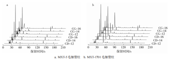 對(duì)充氮和常規(guī)包裝的醇化片煙樣品進(jìn)行快速氣相電子鼻分析,得到2根不同極性色譜柱對(duì)應(yīng)的揮發(fā)性成分指紋圖譜,結(jié)果如圖3所示。可以看出,不同包裝片煙的色譜峰在52~68個(gè)之間,其峰面積也不相同,說(shuō)明樣品揮發(fā)性成分種類(lèi)和含量存在一定差異。且不同醇化時(shí)間下,同一包裝片煙的揮發(fā)性成分種類(lèi)和含量也有明顯差別。