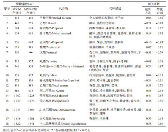 在PCA分析的基礎(chǔ)上,將各組分的保留時(shí)間轉(zhuǎn)化為保留指數(shù),再通過(guò)AroChembase數(shù)據(jù)庫(kù)(包括15萬(wàn)種化合物的保留指數(shù)值)進(jìn)行定性,篩選出了18種可能的差異揮發(fā)性成分,并進(jìn)行感官描述。醇化片煙揮發(fā)性差異成分、感官描述信息及相關(guān)系數(shù)見(jiàn)表1??梢钥闯觯煌b方式和醇化時(shí)間片煙中的主要揮發(fā)性差異化合物包括醇類(lèi)(7種)、醛類(lèi)(2種)、酯類(lèi)(2種)、雜環(huán)化合物(2種)和其他化合物(5種)。結(jié)合圖3的峰面積可知,各處理醇化片煙中含量較高的化合物均為醋酸、異丙醇、甲酸甲酯、β-大馬酮和戊醛。