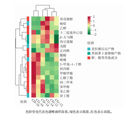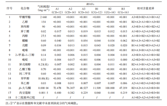 為確定差異揮發(fā)性化合物對(duì)醇化片煙氣味的貢獻(xiàn)程度,篩選出的主要差異化合物進(jìn)行ROAV分析,采用面積歸一化法計(jì)算化合物的相對(duì)含量,采用AroChembase數(shù)據(jù)庫(kù)和文獻(xiàn)中檢索到的化合物氣味閾值為嗅覺(jué)閾值。18種主要差異化合物中,β-大馬酮的相對(duì)含量較高,且嗅覺(jué)閾值較低,因此定義CG-14中的β-大馬酮(相對(duì)含量最高)的ROAV值為100。