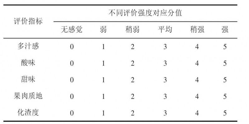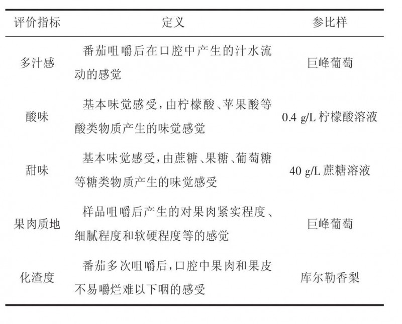 根據食品感官分析審評員的選拔標準《感官分析選拔、培訓與管理評價員一般導則第1部分:優(yōu)選評價員》(GB/T 16291.1-2012)從標準中心內部篩選了7名感官評價員組成櫻桃番茄優(yōu)選評價員小組。按照GB/T39625-2020中所述的方法對櫻桃番茄口感品質進行描述性分析,篩選出多汁感、酸味、甜味、果肉質地和化渣度等5個指標作為評價櫻桃番茄口感特性指標,并制定評分標準(表2)。組織評價員小組對5種櫻桃番茄的感官品質特性開展評價工作(表3),每種番茄提供3顆樣品,番茄樣品采用三位數隨機編碼后依次呈遞給感官評價員,其間用清水漱口消除樣品間相互影響。