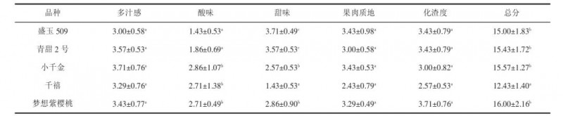 從表8可以看出,整體來看5種櫻桃番茄的多汁感、果肉質地和化渣度的評分差異不顯著,酸味和甜味的評分存在差異。其中,‘盛玉509’和'青甜2號’酸味評分最低,甜味評分最高,與其它3種番茄差異顯著,但這兩種番茄的酸味和甜味評分不存在顯著差異。'千禧的甜味強度評分最低,顯著低于其余4種番茄。王仁杰等的研究也發(fā)現,消費者對淺色櫻桃番茄酸甜感(綠色、黃色)喜好度評分顯著高于深色品種。