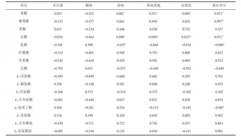 如表9所示,各類氨基酸含量與感官評價得分相關性不顯著。果糖、總糖含量與甜味、果肉質地和化渣度評分呈顯著正相關,與感官評價總分呈極顯著正相關;葡萄糖含量與果肉質地呈顯著正相關,與感官評價總分呈極顯著正相關關系;乳酸含量與感官評價總分呈顯著負相關。